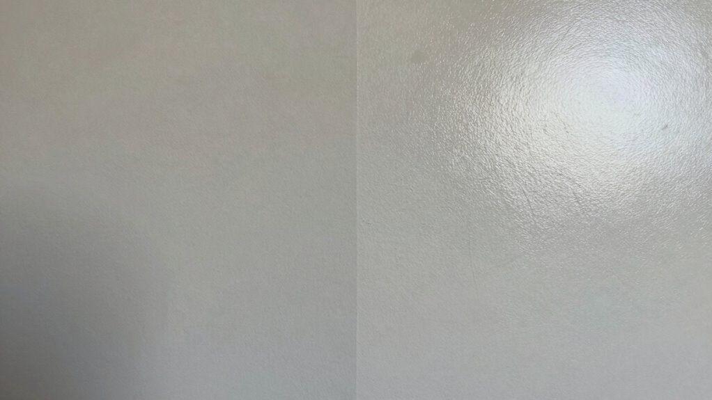 Visual texture contrast plays a significant role in how you perceive different paint finishes, especially when comparing flat and satin surfaces. The textural contrast influences the visual impact of a room, making surfaces appear more or less prominent. Flat finishes tend to diffuse light, creating a smooth, matte look that minimizes imperfections. Satin finishes, with their slight sheen, enhance the surface’s texture, adding subtle depth. To maximize visual impact, consider these points: