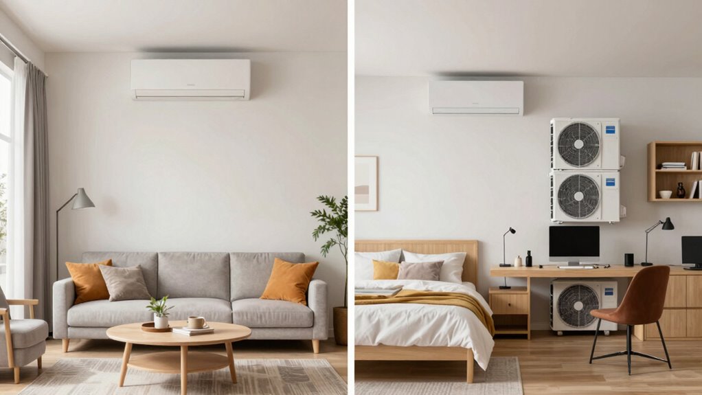 In real homes, choosing between single-zone and multi-zone mini splits changes how you control comfort and energy use. With single-zone systems, you focus on one room or area, making setup simple and energy-efficient. Multi-zone setups allow you to independently regulate multiple rooms, offering greater flexibility but at a higher cost and installation complexity. If you want to understand which option fits your home best, you’ll find useful details as you explore further.