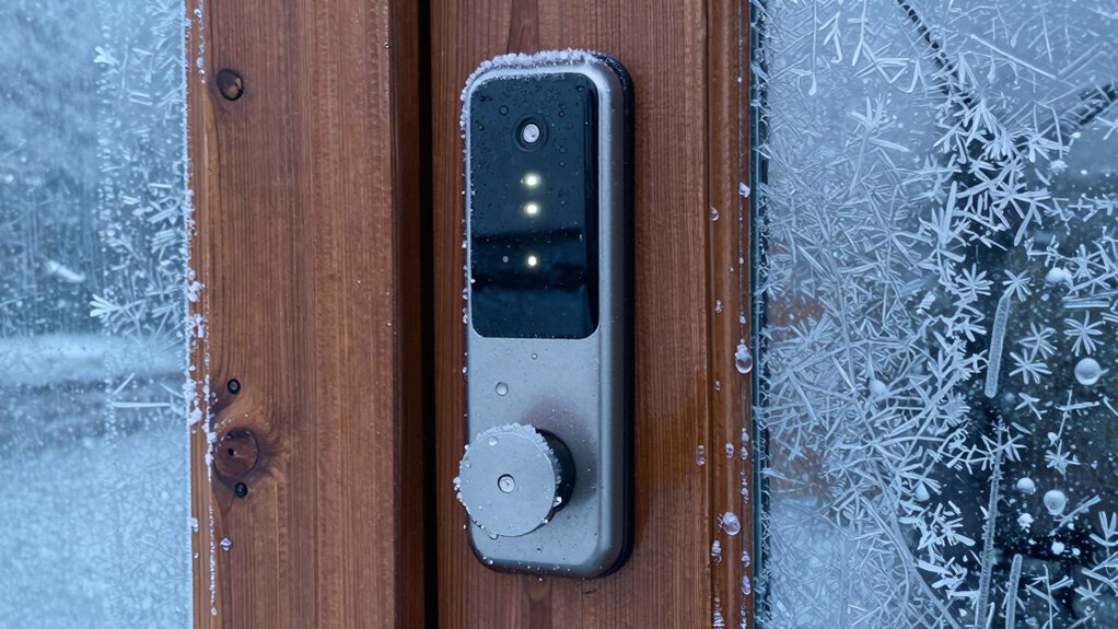 Extreme temperatures can quickly drain your smart lock’s battery or cause it to fail entirely, leaving your home vulnerable. Cold weather slows down the chemical reactions inside the battery, reducing its capacity and risking lockouts. On the other hand, excessive heat accelerates battery depletion and may damage internal components. Keeping your batteries within ideal temperature ranges is vital for reliability. If you want to understand how to protect your lock from these risks, continue exploring the details.