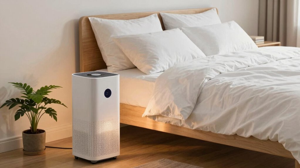 Poor air quality in your bedroom can silently sabotage your sleep, even if you think your environment is comfortable. You might have the perfect mattress, cozy bedding, and a cool temperature, but if the air you breathe isn’t clean, your sleep quality suffers. One of the most effective ways to improve indoor air quality is by paying attention to air purifier placement. You want to position your purifier where it can maximize airflow and filtration without obstructions. Ideally, place it in a central location, away from walls or furniture that could block the intake or output vents. Keeping it at a reasonable height—perhaps on a small table or stand—ensures it circulates air effectively throughout your sleeping space. Proper placement helps the purifier capture dust, allergens, pet dander, and other airborne pollutants before they reach your lungs, reducing irritation and promoting deeper rest. Ensuring proper airflow and filtration is essential for maintaining healthy indoor air quality. Humidity control is another critical factor often overlooked in maintaining healthy bedroom air. Too much moisture creates a damp environment where mold, mildew, and dust mites thrive, all of which can trigger allergies and disrupt sleep. Conversely, overly dry air can cause throat irritation, dry skin, and congestion, making it harder to breathe comfortably at night. Maintaining ideal humidity levels—generally between 40% and 60%—creates a balanced environment that discourages mold growth and keeps your nasal passages moist. Using a humidifier or dehumidifier, depending on your room’s conditions, can help you achieve this balance. Regularly monitoring humidity levels with a hygrometer ensures you don’t go too high or too low, allowing you to adjust your devices accordingly. Additionally, proper ventilation plays a vital role in keeping indoor air fresh and reducing indoor pollutants. Incorporating air quality monitoring devices can help you stay aware of potential pollutants and make informed adjustments. Good air circulation also prevents stagnant air, which can harbor allergens and pollutants. Proper air purifier placement and humidity control are essential because they directly influence the removal of airborne pollutants and moisture imbalances. Combining proper air purifier placement with humidity control greatly improves your bedroom’s air quality, creating an environment conducive to restful sleep. When your air is cleaner, and moisture levels are just right, you’re less likely to wake up feeling congested, stuffy, or restless. These small adjustments can make a big difference in how quickly you fall asleep and the quality of your rest throughout the night. Remember, the goal isn’t just having a cool or cozy room but ensuring that the air you breathe is as pure and balanced as possible. Paying attention to these habits supports your overall health and makes waking up refreshed and energized a real possibility every morning.