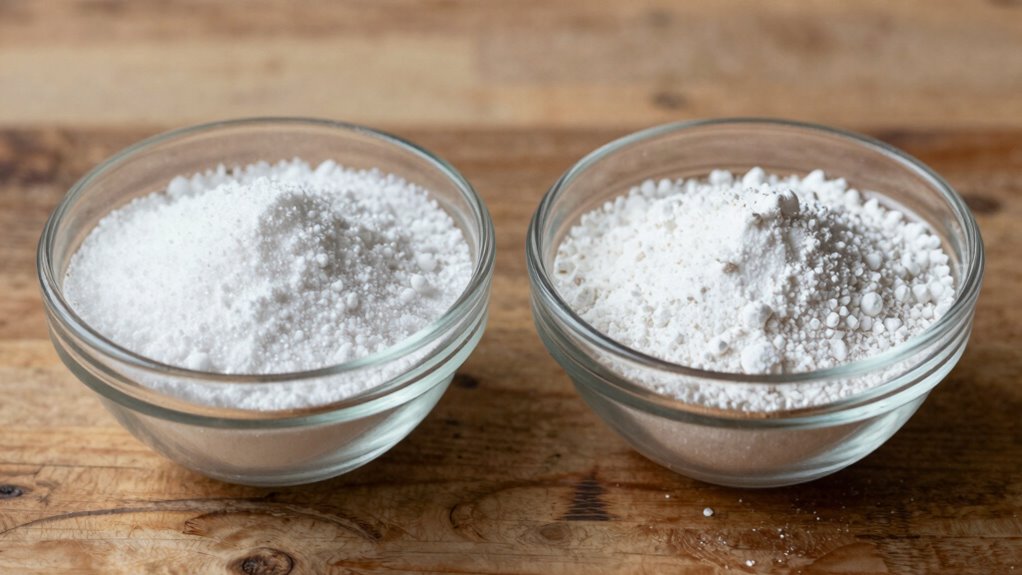 Baking soda is pure sodium bicarbonate that reacts quickly with acids like vinegar or lemon juice to produce carbon dioxide, helping baked goods rise. Baking powder contains both acid and base, releasing gas when wet and heated, making it ideal for recipes without added acids. Knowing when to use each depends on your ingredients. Keep in mind that proper ratios and handling are key—more details are just ahead to help you bake perfectly.