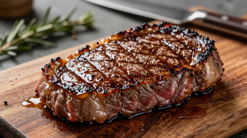 Resting meat doesn’t just help juices redistribute; it also allows the temperature to stabilize. When you remove meat from the heat, residual heat continues to cook the interior, causing a slight rise in temperature—a process known as carryover cooking. Resting helps this heat evenly spread, balancing the meat’s temperature and preventing overcooking. This stabilization is vital for maintaining the desired doneness. Additionally, resting time can enhance marbling by allowing intramuscular fat to settle, improving flavor and tenderness. It also aids seasoning absorption, as juices redistribute and carry flavors deeper into the meat. By giving your meat time to rest, you ensure a more consistent temperature, better marbling, and enhanced seasoning, resulting in a perfectly cooked, flavorful piece of meat. Proper resting also aligns with environmental considerations, such as reducing waste and optimizing cooking efficiency.