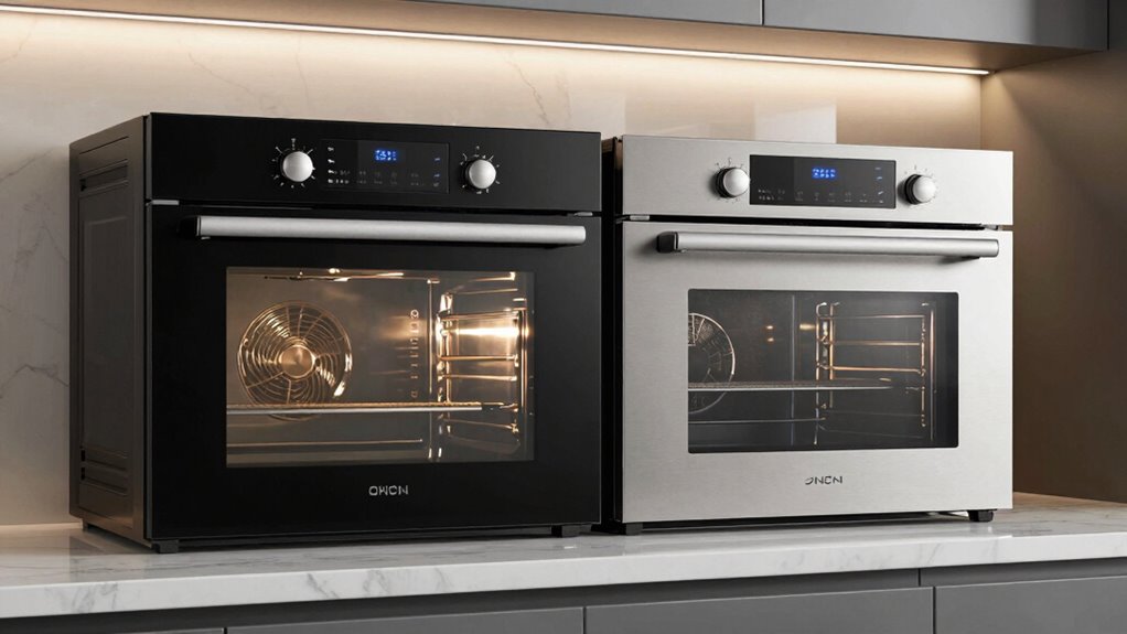 Convection ovens generally use more energy than traditional ovens because their fans and motors require extra power. However, they’re often more efficient overall, as they cook faster and evenly, saving you time and energy in the long run. When you compare energy consumption, convection ovens might seem higher initially, but their efficiency makes up for it by reducing cooking time, making them a smart choice for energy-conscious users.