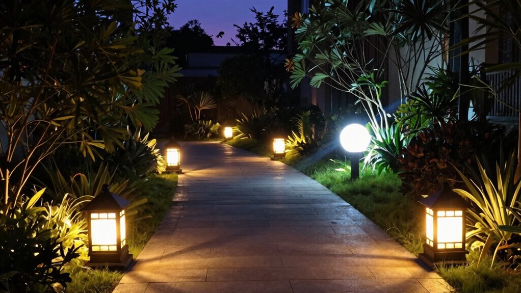 Imagine reducing your energy bills effortlessly—there’s a secret to outdoor lighting savings. You can switch to solar alternatives that harness sunlight, cutting power use entirely. Adding motion sensors ensures lights only turn on when needed, preventing waste. These options not only save energy but also boost security and convenience. By choosing solar and motion sensors, you’re making smart, eco-friendly decisions that brighten your space efficiently and sustainably.