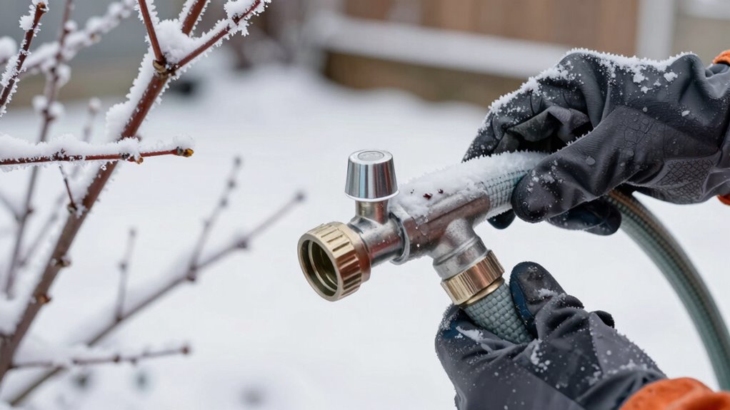 You shouldn’t winterize outdoor faucets without turning off the main water shutoff, as this prevents water from entering the faucet and causing damage. Once you shut off the main water supply, follow faucet drain procedures to remove any remaining water. This step is vital because it guarantees your outdoor faucet won’t freeze or burst, saving you from costly repairs come winter. Always prioritize shutting off the main water supply first.