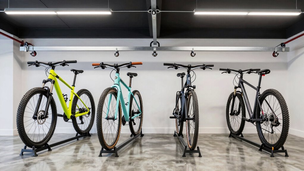 • Overview of top ceiling-mounted bike racks supporting multiple bikes with adjustable features for optimal space utilization.