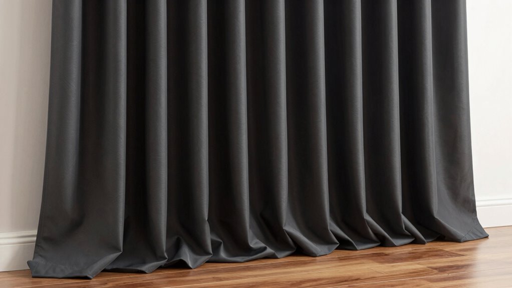 Choosing blackout curtains with high light blocking efficiency is essential for creating a truly dark bedroom environment, especially if you want to sleep soundly during the day or block out streetlights at night. Look for curtains that block at least 85% of light or more, which often means selecting those with dense fabrics or triple-layer construction. Blackout coatings or linings can boost light blockage considerably compared to standard curtains. Darker colors also tend to block more light than lighter shades, helping to darken your room further. Proper installation is vital—making sure the curtains extend beyond the window frame minimizes light leaks around the edges. When these factors come together, you’ll enjoy a more restful, undisturbed sleep regardless of outside light conditions.