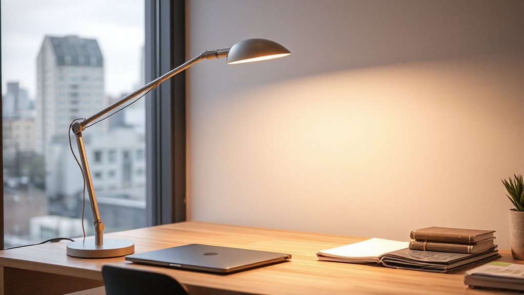 When choosing a desk lamp to combat eye strain, I always seek stylish, sturdy, and soothing solutions. By balancing brightness, flexibility, and features like dimming or USB ports, you can create a comfortable, clutter-free workspace. Remember, the right light lifts your mood, minimizes fatigue, and maximizes focus. So, select sensibly, shine brightly, and safeguard your sight—because a well-wired workspace wards off weariness and worry.