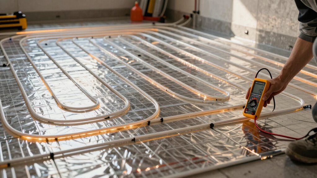 Maintenance for electric radiant floor heating is minimal but important. I check the thermostat and wiring periodically to guarantee everything functions smoothly. I also keep an eye out for any signs of damage or irregular temperature fluctuations. Regularly inspecting the system helps prevent issues and prolongs its lifespan. Typically, I only need to perform these simple checks annually, and most kits are designed to require very little ongoing maintenance.