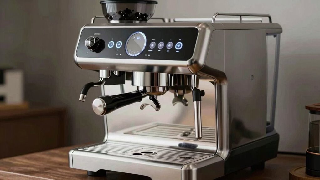 Building a durable heat exchanger espresso machine requires careful attention to material quality and construction. High-quality machines use stainless steel or brass, which resist corrosion and guarantee longevity. The construction of the boiler and heat exchange components directly affects their ability to handle continuous use without degrading. Robust welds and secure fittings are essential to prevent leaks and maintain consistent thermal performance over time. Material thickness and manufacturing precision also play vital roles in durability, reducing the risk of cracks or failures during operation. Additionally, proper insulation and strict quality control during production help stabilize temperatures and extend the lifespan of the heat exchange system. Focusing on these factors ensures you choose a machine built to last and perform reliably over years of use.