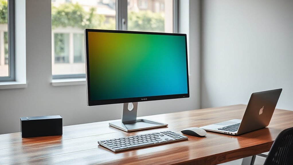 Choosing the right screen size and resolution is essential for maximizing your 27-inch external monitor’s benefits. A 27-inch display offers plenty of space for multitasking and improves productivity. For resolution, Full HD (1080p) provides sharp visuals, but if you want crisper images—especially for creative work—higher options like 1440p or 4K are better. It’s important to match the resolution with your intended use; higher resolutions reveal finer details and reduce eye strain. Also, guarantee the monitor’s pixel density aligns with your laptop’s capabilities to prevent scaling issues and maintain clear images. Larger screens with higher resolutions not only enhance viewing comfort but also allow you to see more content at once, making your work more efficient.