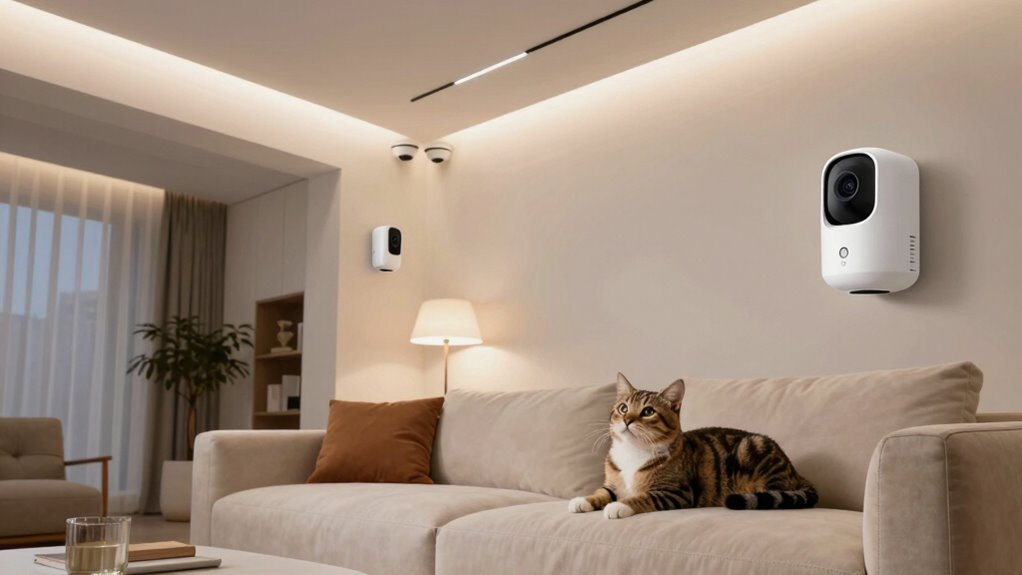 Choosing an indoor security camera for pets means paying close attention to its night vision capabilities, as effective low-light performance guarantees you can monitor your pet around the clock. A good camera should offer night vision that extends up to 30 feet, providing clear visibility in dark rooms. Cameras with infrared LEDs or advanced night vision tech can even deliver full-color images in darkness, making it easier to identify your pet’s activity. No-glow IR LEDs are ideal because they don’t disturb or frighten your pet with visible light. The quality of night vision depends on sensor sensitivity and IR light strength, with higher specs producing sharper images. Proper placement in a dark room also boosts performance by reducing obstructions and reflecting more light for better clarity.
