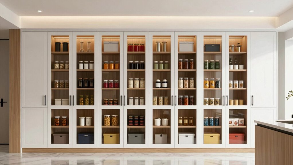 Durability is just one aspect to contemplate; storage flexibility also plays a key role in making a tall pantry cabinet truly functional. Adjustable shelves are essential, as they let me customize space for items of different heights and sizes. Repositionable or removable shelves help me optimize storage for larger or oddly shaped items. Cabinets with multiple compartments and doors keep everything organized and easily accessible, tailored to my needs. Internal racks and dividers maximize vertical space and prevent clutter. Versatile features like removable drawers or modular components make reconfiguring the layout simple, adapting to changing storage demands. Overall, a flexible design ensures I can make the most of my space, keeping my pantry organized, accessible, and adaptable as my needs evolve.