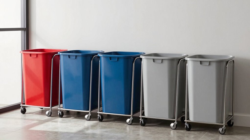 When selecting a heavy-duty laundry hamper with wheels, I consider factors like durability and material quality to guarantee it lasts. I also look at capacity and size options to match my laundry needs, along with the type of wheels for smooth mobility. Additionally, features like ease of cleaning and security options can make a big difference in my daily use.