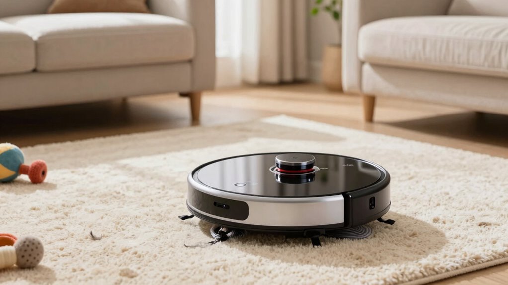 Think of robot vacuums as tiny explorers with a keen eye for danger. They can detect and avoid pet toys or delicate items thanks to advanced sensors and AI technology. I’ve found that models with cliff sensors and obstacle detection simply sidestep fragile objects, preventing mishaps. So, you don’t have to worry about your favorite vase or pet toys getting crushed—these little robots are smarter than you think!