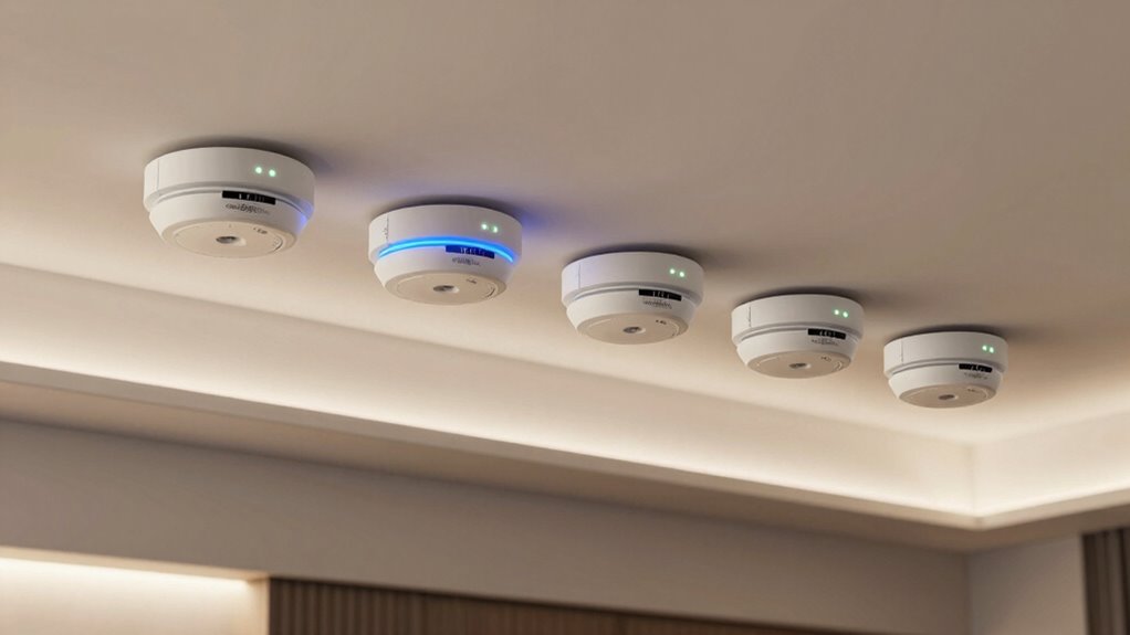 Choosing the right connectivity options is vital to guarantee your smart smoke detector works seamlessly and keeps you informed in real-time. I look for detectors that support reliable Wi-Fi or Bluetooth, ensuring smooth app integration and instant remote alerts. Compatibility with my existing smart home ecosystem, like Alexa, Google Assistant, or Apple Home, is essential for effortless control. I also prioritize alarms that send real-time notifications through dedicated apps, so I’m alerted immediately to smoke or CO detection. Interconnectivity features are a bonus, allowing multiple units to activate simultaneously for all-encompassing coverage. Finally, I consider detectors that support local automation protocols like Matter or Thread, which provide secure, cloud-independent communication and enhance overall reliability. These connectivity options ensure my home stays safe and responsive.