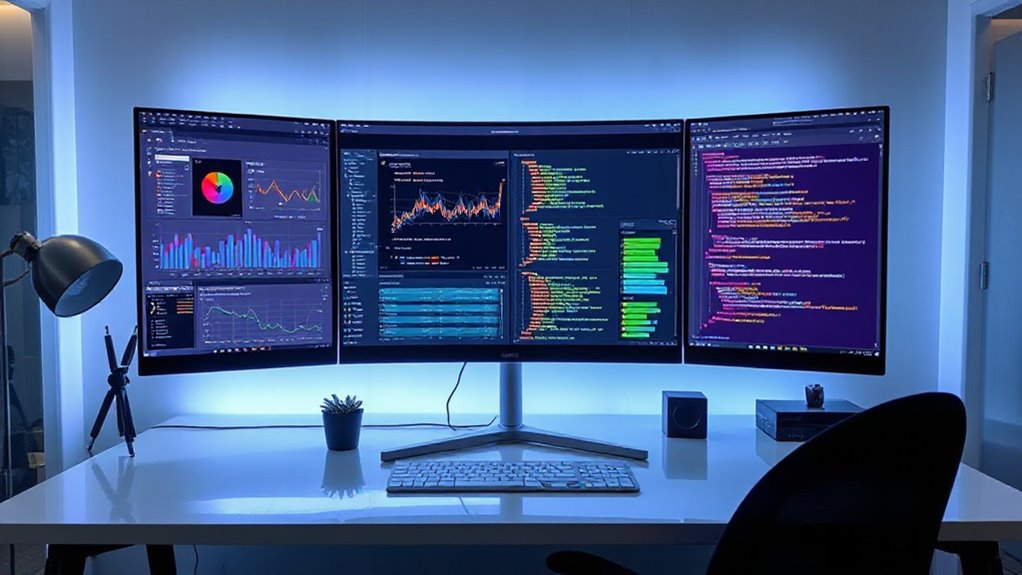 Have you considered how the connectivity options on an ultrawide monitor can impact your workflow? It’s vital to look for multiple input ports like HDMI, DisplayPort, and USB-C, so you can connect various devices simultaneously. USB-C support is especially useful because it can handle data, video, and power through a single cable, reducing clutter on your desk. Make certain to check if you’ll need adapters or if your devices are compatible with the monitor’s connections to avoid hassle. Features like Picture-in-Picture (PIP) and Picture-by-Picture (PBP) can boost multitasking, letting you view multiple sources at once. Ultimately, verify compatibility with your peripherals to guarantee your setup remains flexible and efficient, streamlining your workflow without interruptions.